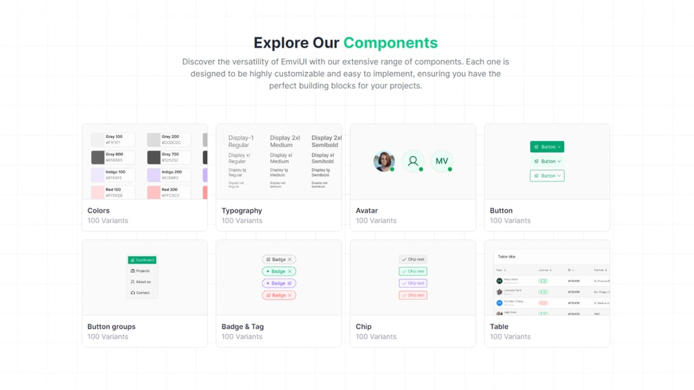 As designers who tackle real-world challenges daily, we created EmviUI to streamline your design process. We've included everything you need to build websites and applications with speed, precision, and a touch of creativity.